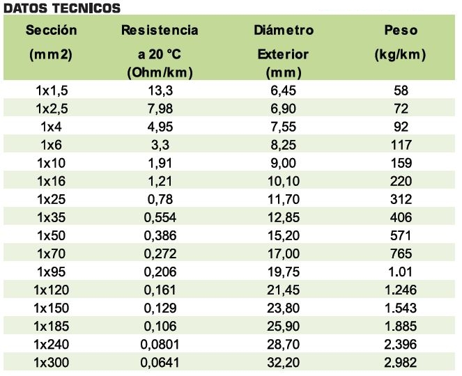 - Aislamiento polietileno reticulado XLPE tipo DIX 3. Según norma UNE HD 603-1 tabla 2A.